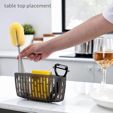Keep your sink area organized and clutter-free with this ultra-slim sponge holder. Designed with a large capacity, it easily stores your dish sponge, scrub brush, bottle cleaner, sink strainer, peeler, and other small kitchen gadgets all in one place.